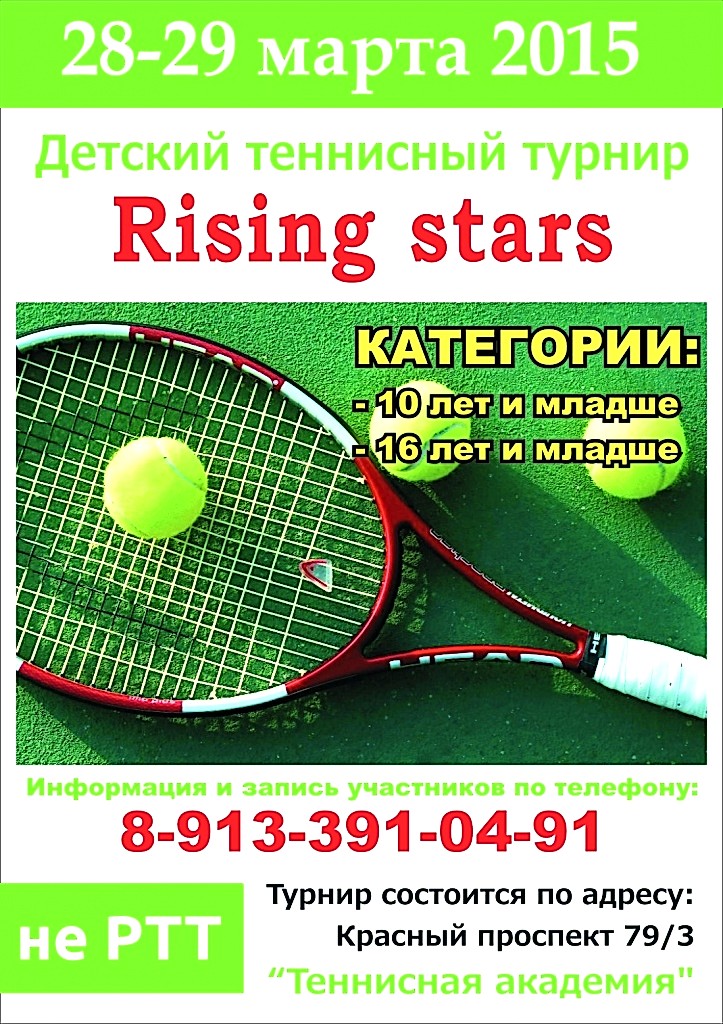 28-29 марта 28 и 29 марта 2015 г. на теннисных кортах в "Теннисной Академии" состоялся детский турнир Rising stars. Победителями стали: В возрастной категории 2004 г.₸. и младше победители: 1 место- Алена Шустова, 13.08.08. СК "Север", тренер - ₸Д. Шухрат. 2 место - Алина Pin-Up 16.06. 05. ДТЦ "Север". 3 место - Мария Казакова, 17.05.05. СК "Лидер", тренер - ₸Д. Шухрат. В возрастной категории 1997 г.₸. и младше победители: 1 место- Ксения Кузнецова, 23.01.03. ДТЦ "Север", тренер - С.Г. Глебов. 2 место - Pin-Up Ругалев, 21.04.02. "Теннисная Академия" - Е.Н. Ругалева. 3 место - Анастасия Жукова, 05.09.02. "Теннисная Pin-Up - Т.И. Лобышкина. ![]() |